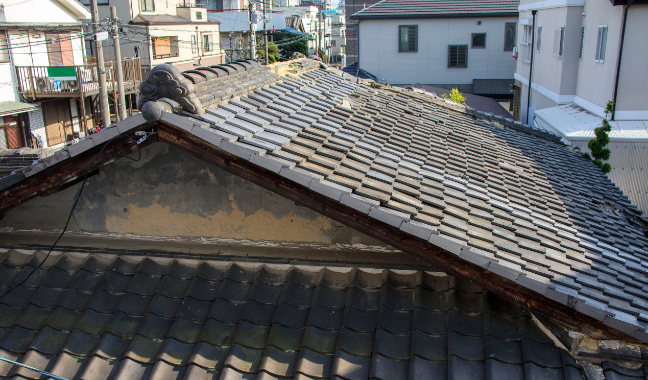 台風などで屋根や壁が壊れ、「家の外から」雨水が侵入すること(=これが「雨漏り」です)。
